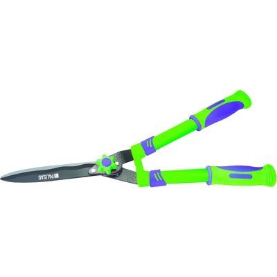 Кусторез с металлическими рукоятками, оснащенными двухкомпонентными ручками, и волнистыминожницеобразными лезвиями. Овальная форма придает рукояткам дополнительную прочность на изгиб.