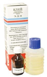 Клей ЭДП поставляется в комплекте: основа – эпоксидная модифицированная смола в полиэтиленовой бутылке и отвердитель с стеклянном флаконе, находящиеся в одной потребительской упаковке.
